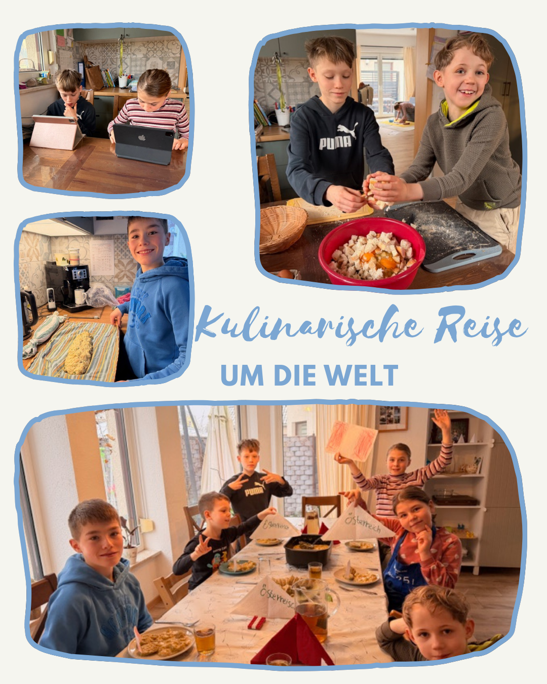Nach spannenden Stationen in China, Spanien und Polen führte uns das vergangene Wochenende nach Österreich. Gemeinsam zauberten die Kinder Serviettenknödel mit Geschnetzeltem und als süßen Abschluss einen herrlichen Kaiserschmarrn. Alle packten mit an – vom Schneiden über die Tischdeko bis zur Recherche.